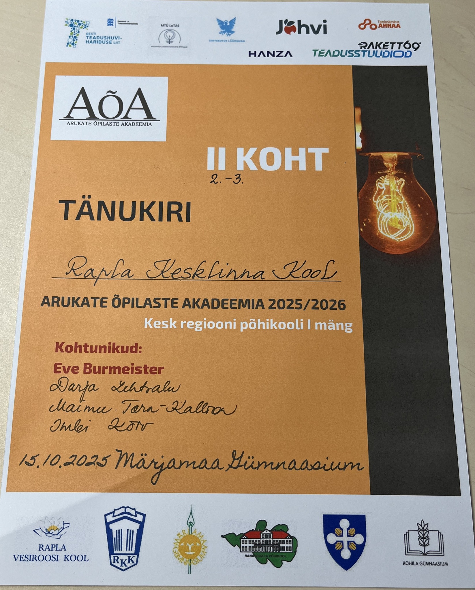 Meie 9. klassi tublid õpilased osalesid täna Märjamaa Rahvamajas, Arukate õpilaste akadeemias. Tulemus pole paha! TUBLID!